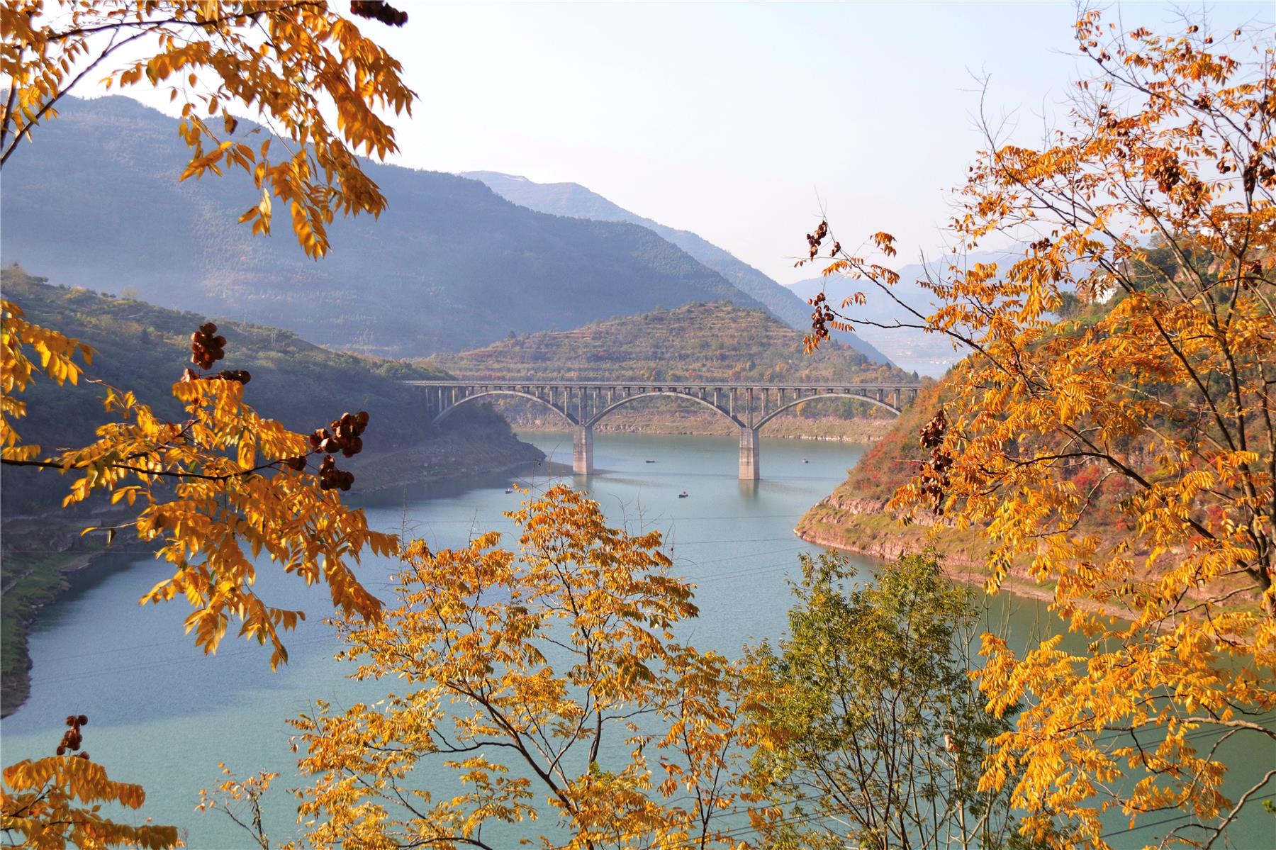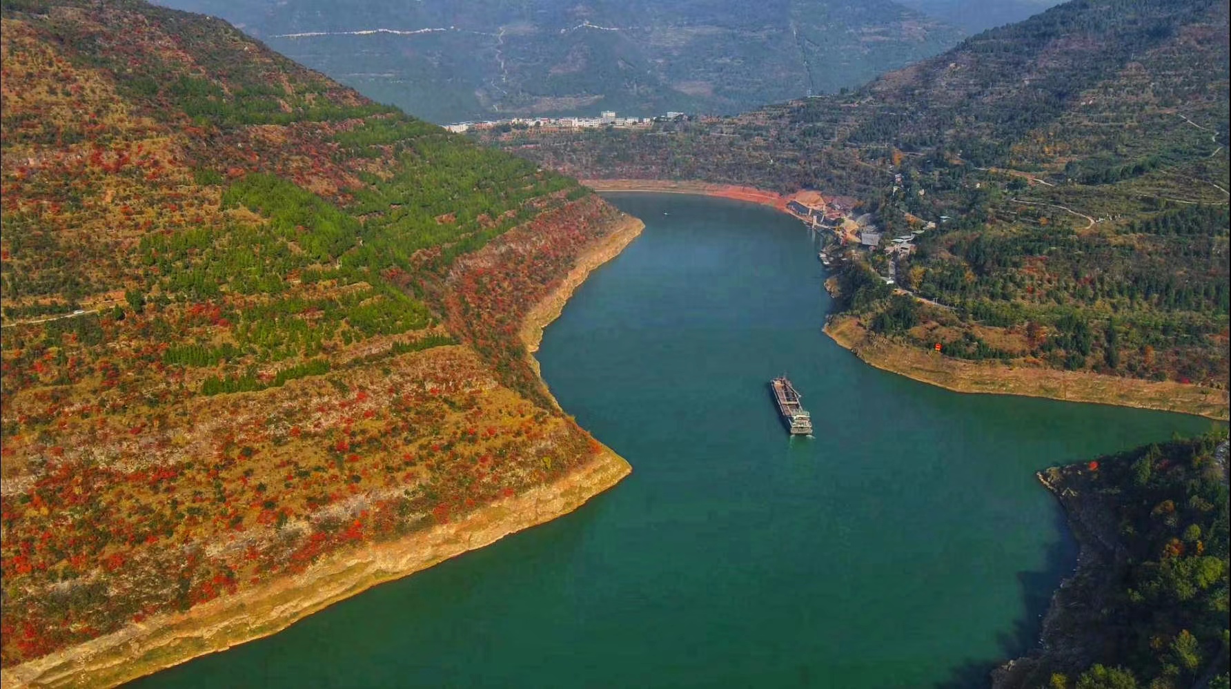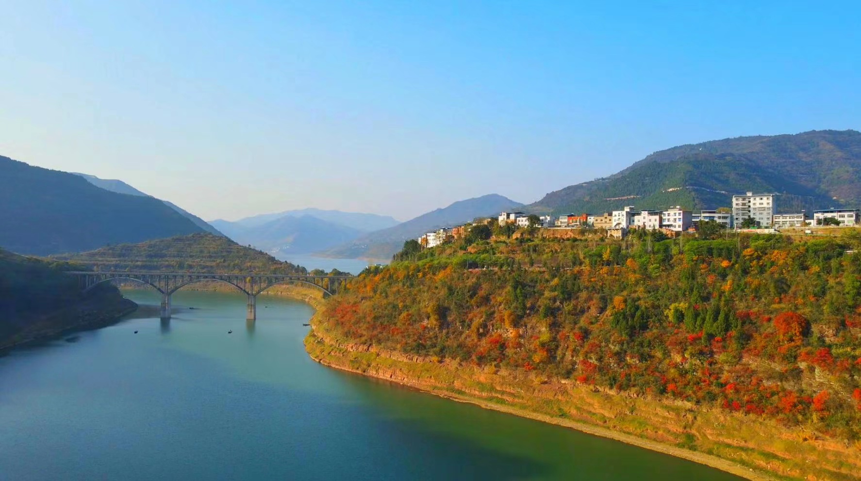 近段時間,長江與磨刀溪交匯處新津鄉境內紅葉樹種進入最佳觀賞期,展現出漫山紅葉映碧水的冬日美景。