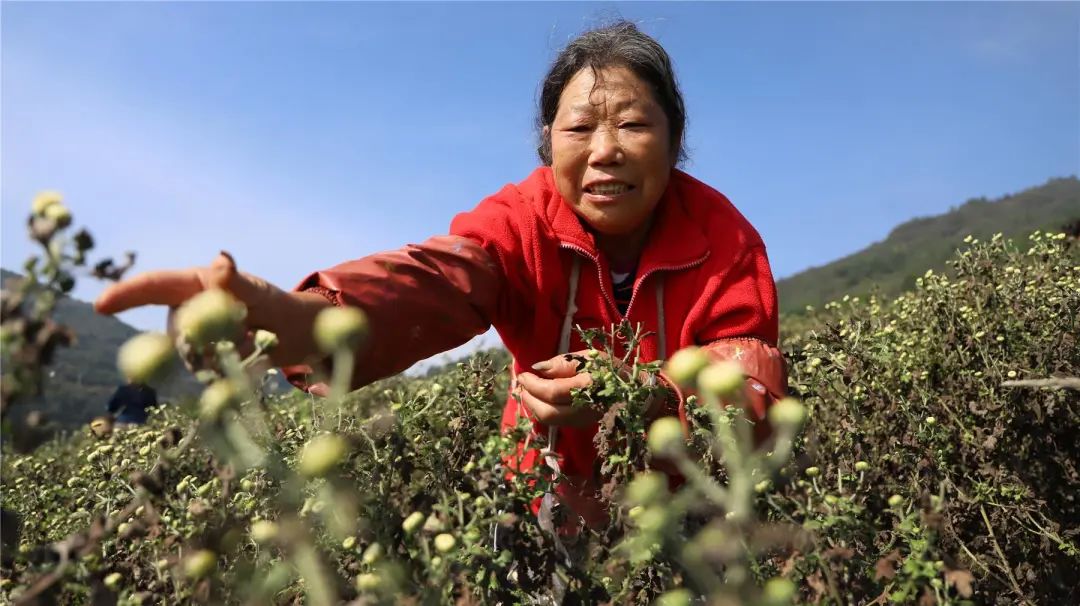 村民韓道銀說:“在基地上工,一天是采摘8個小時,一個人能采摘120多斤菊花,能賺一百多塊錢。”