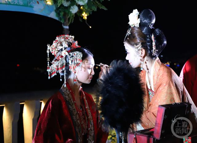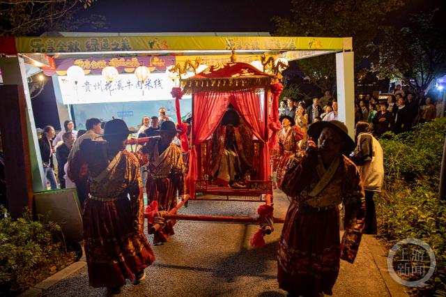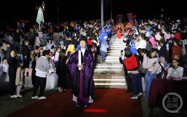10月5日晚,在云陽(yáng)縣月光草坪一生一世長(zhǎng)廊,行加冠之禮后的“新婿”整裝待發(fā),用八抬大轎的方式迎娶“新婦”。