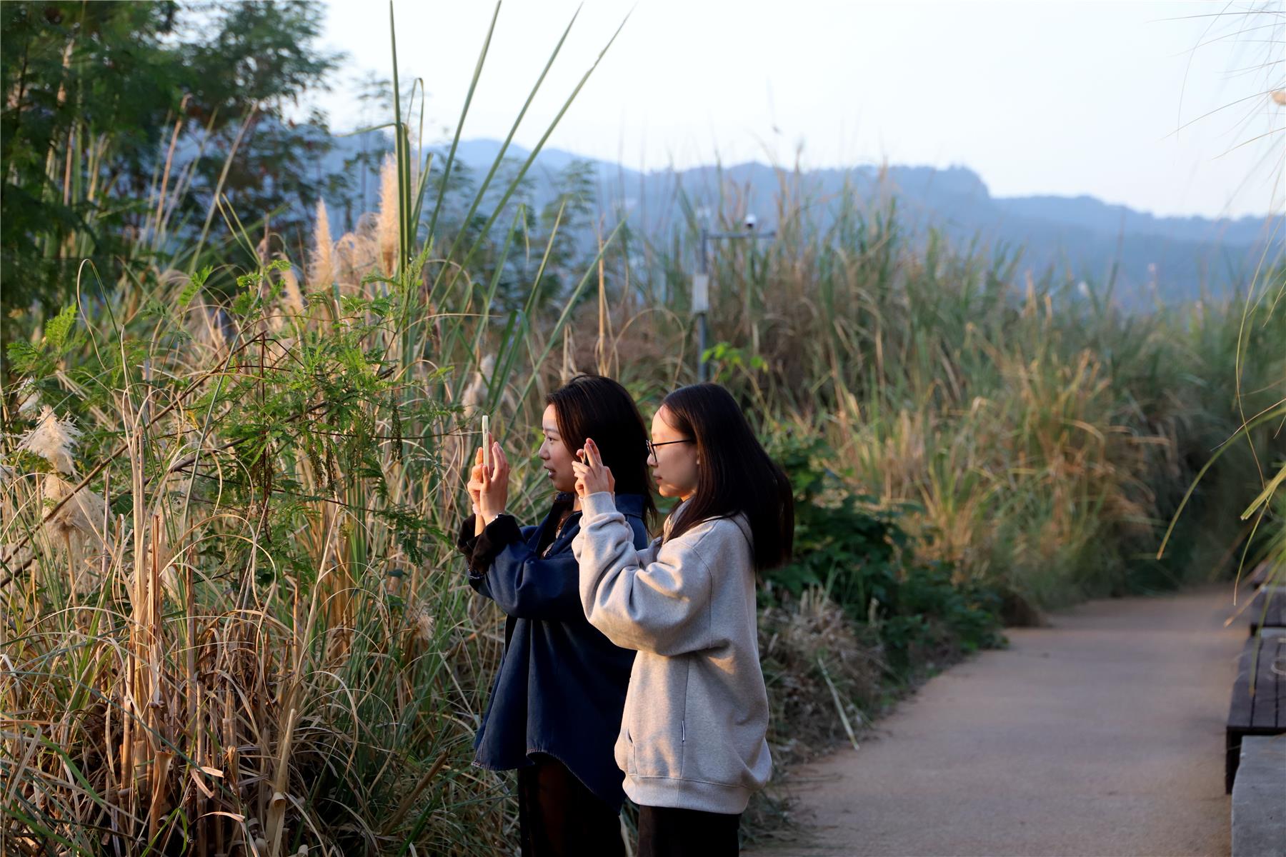 在環湖綠道白鷺公園,一株株如雪花般的蘆葦花紛紛揚揚,盛開成一片夢幻海洋,微風輕拂,潔白的蘆葦花搖曳生姿。每當夕陽西下,江面上波光粼粼,點點碎金。晚霞映照在蘆葦叢中,金色的光輝與蘆葦的金黃相互映襯,構成了一幅動人的畫面,不少市民來此打卡,記錄下這動人的時刻。