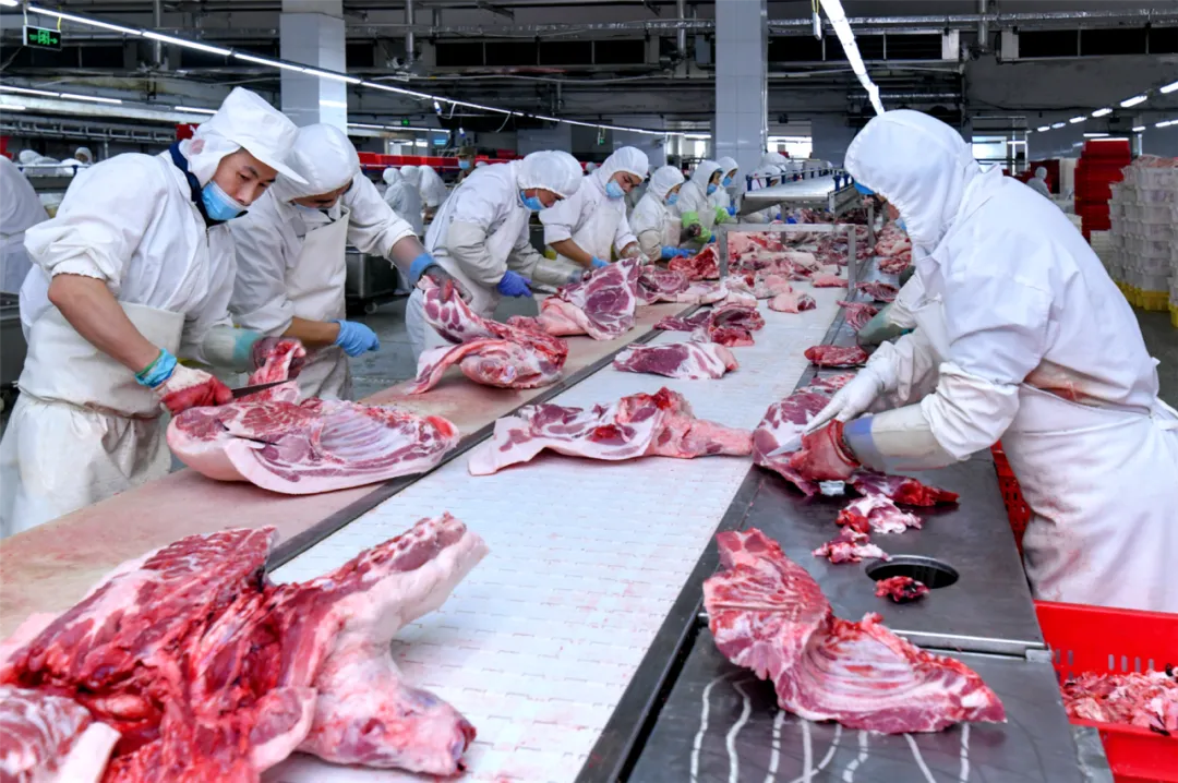 新鮮宰殺的豬肉整齊地擺放在案板上