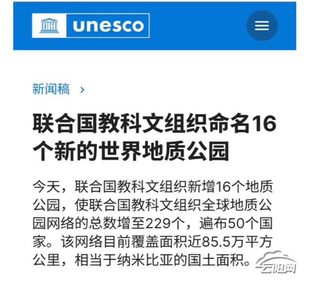 聯(lián)合國教科文組織官網(wǎng)報道云陽世界地質(zhì)公園