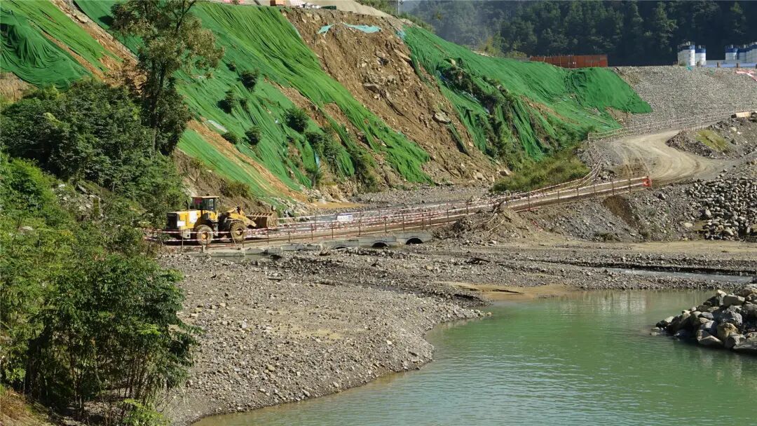 大型挖掘機揮舞著鐵臂,在壩基處精準作業
