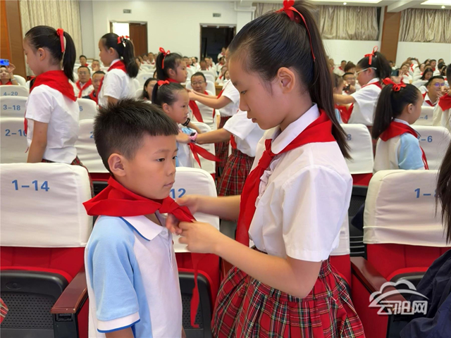 活動在節(jié)目《追夢傳承》的精彩表演中拉開序幕。隨后,伴隨著激昂的出旗曲,標(biāo)準(zhǔn)化入隊(duì)儀式示范活動正式開始。旗手們高舉中國少年先鋒隊(duì)隊(duì)旗,邁著整齊的步伐走向舞臺。佩戴上鮮艷的紅領(lǐng)巾,新隊(duì)員們高舉右拳,在隊(duì)旗下莊嚴(yán)宣誓:“我是中國少年先鋒隊(duì)隊(duì)員...”稚嫩而堅(jiān)定的聲音,展現(xiàn)了新時代少先隊(duì)員的精神風(fēng)貌。