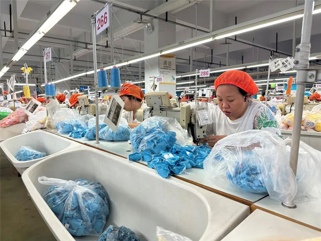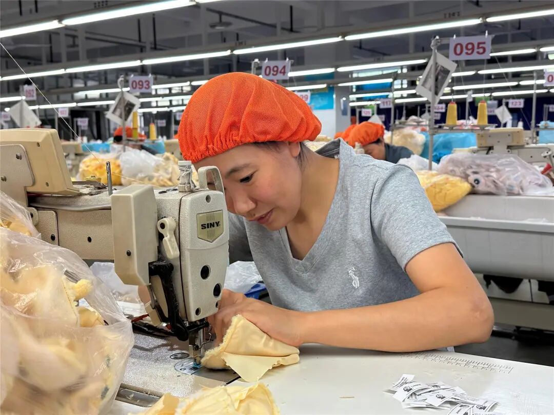 在重慶雄業玩具制衣有限公司的車間里,一片熱火朝天的生產景象。工人們在各自的工位上忙碌著,裁剪、刺繡、充棉、打包……各道工序上的工人們動作熟練,緊張有序。