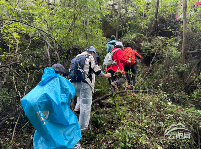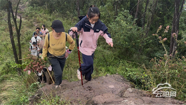 行進途中,盡管路面濕滑、坡度較陡,隊伍始終笑聲不斷。大人們彼此照應,孩子們在山間拾花探趣,沿途的互動讓這場旅程多了幾分溫情與力量。“今天雖然下了小雨,路上也有些泥濘,但他一路撿拾花草、到處尋寶,玩得特別開心。”市民郭春燕笑著說。
