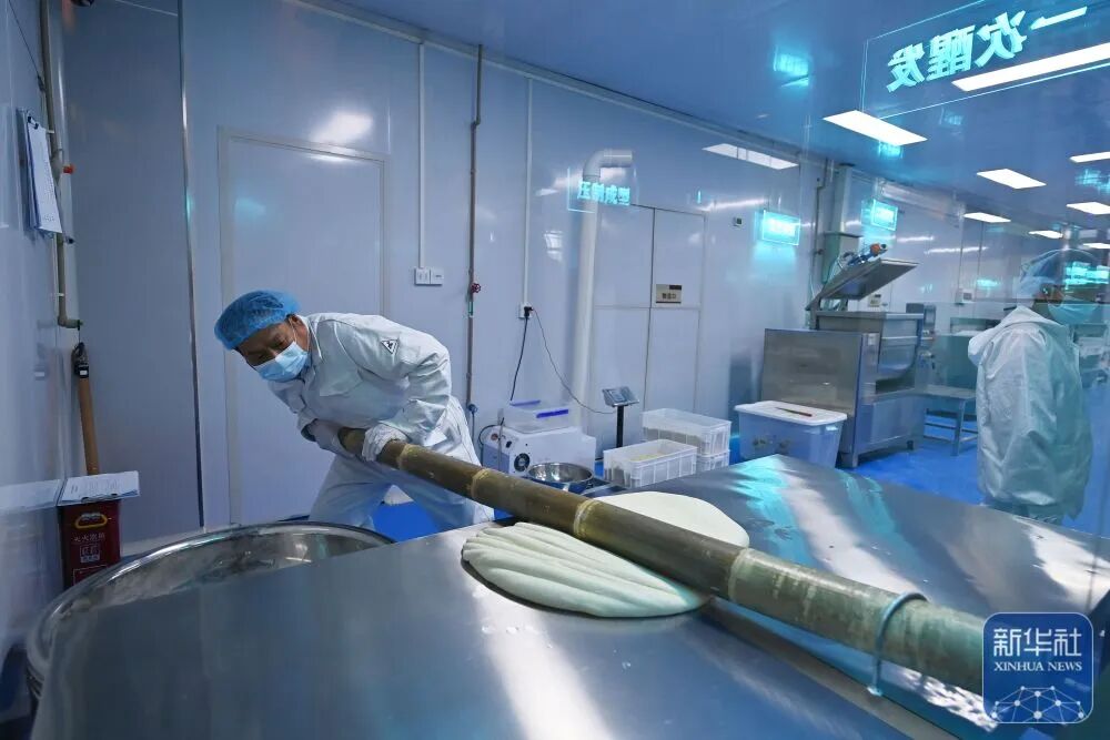 ↑ 11月4日,在巴陽杠子面生產工廠,巴陽杠子面傳統制作技藝傳承人劉益在展示制作技藝。巴陽杠子面是重慶市云陽縣的傳統面食之一,發源于巴陽峽兩岸,以竹杠壓面工藝和獨特口感著稱。