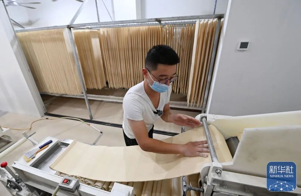 ↑ 11月5日,喜禾麥面業創始人宋喜在重慶市云陽縣喜禾麥面業的標準作坊制作面條。1989年出生的宋喜從銀行辭職,于2024年開始創業做喜禾麥面業。