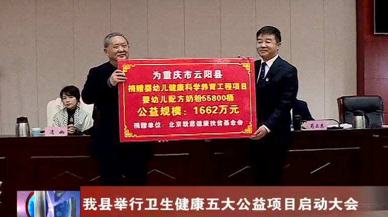 1月20日,云陽縣舉行衛(wèi)生健康五大公益項目啟動大會,北京聯(lián)慈健康扶貧基金會現(xiàn)場捐贈價值4842萬元的孕優(yōu)生工程項目……