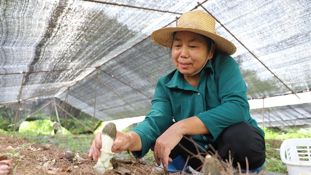 連日來,木南村的三十多畝紅托竹蓀迎來采收旺季。大棚內、林蔭下,一朵朵形似紗裙、色澤潔白的竹蓀破土而出,三四十名本村村民正忙著采摘、分揀。這片生機勃勃的景象,源于村集體年初的主動謀劃。