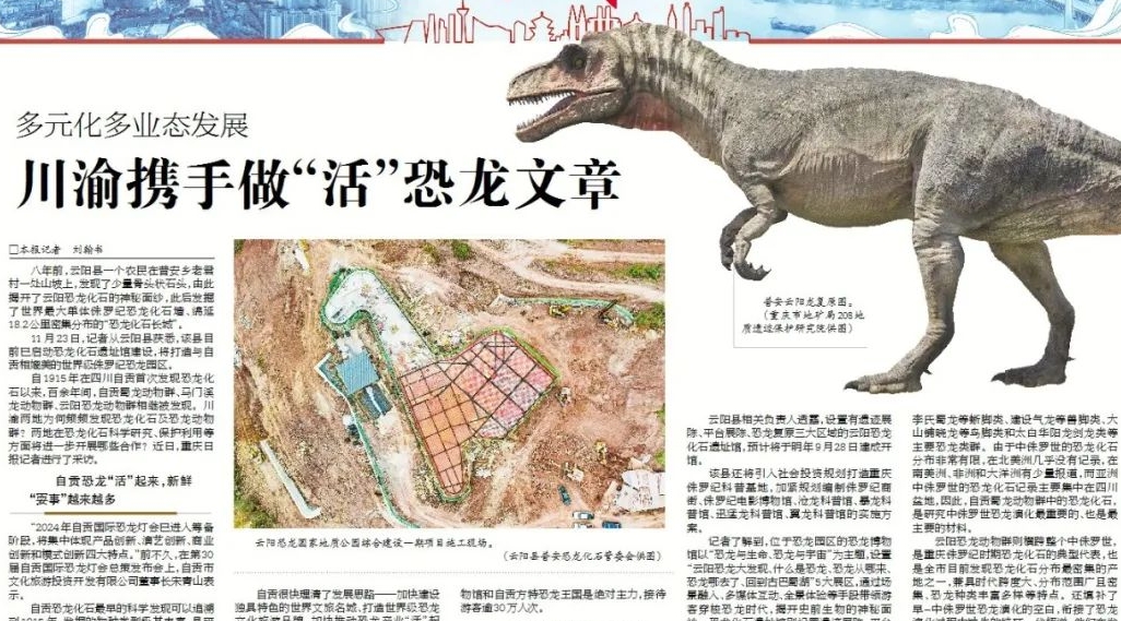 八年前,云陽(yáng)縣一個(gè)農(nóng)民在普安鄉(xiāng)老君村一處山坡上,發(fā)現(xiàn)了少量骨頭狀石頭,由此揭開了云陽(yáng)恐龍化石的神秘面紗,此后發(fā)掘了世界最大單體侏羅紀(jì)恐龍化石墻、綿延18.2公里密集分布的“恐龍化石長(zhǎng)城”。